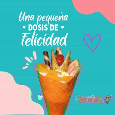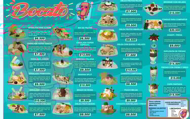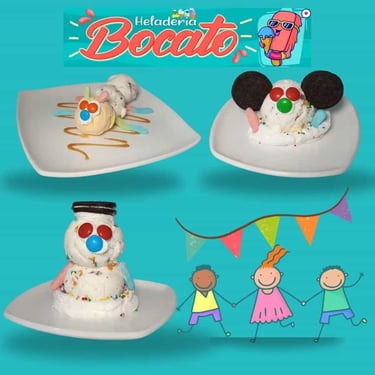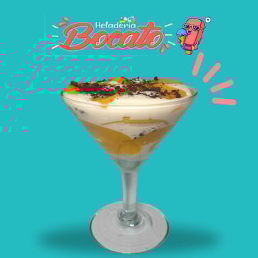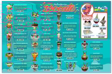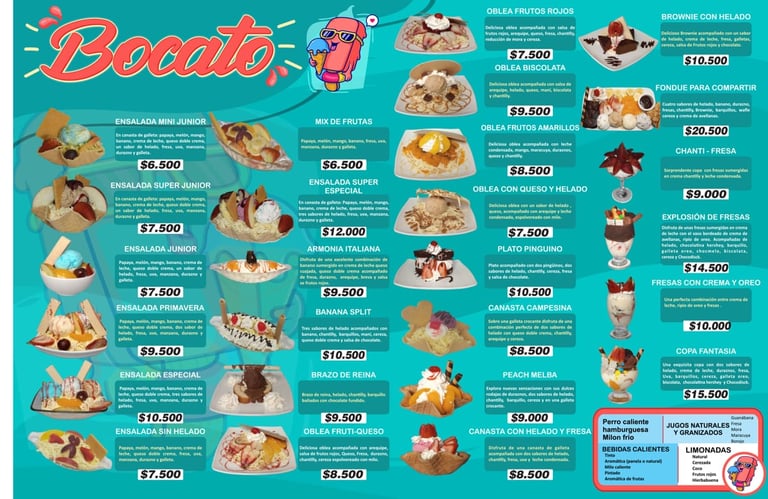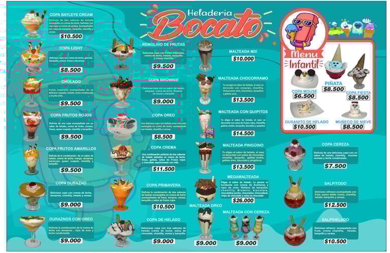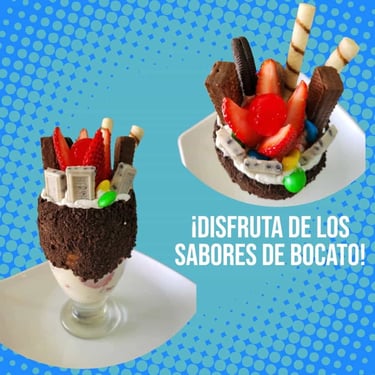 En Bocato encontrarás gran variedad y combinación de sabores, tenemos Copas con diferentes sabores,, Cholado, Malteadas, Salpitodos, Ensalada de Frutas, Banana Split, Brazo de Reina, Obleas, Canastas con Helado, Brownie con Helado, Hamburguesa, Perro Caliente, Bebidas Calientes, Jugos, Granizados, Limonadas y muchas delicias mas.